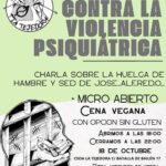 CONTRA LA VIOLENCIA PSIQUIÁTRICA ———— Charla sobre la huelga de hambre y sed de José Alfredo +Micro abierto Cena vegana (opción sin gluten) ——— Abrimos a las 18:00 Cerramos a las 22:00 Csoa la tejedora Calle batalla de Bailén 17