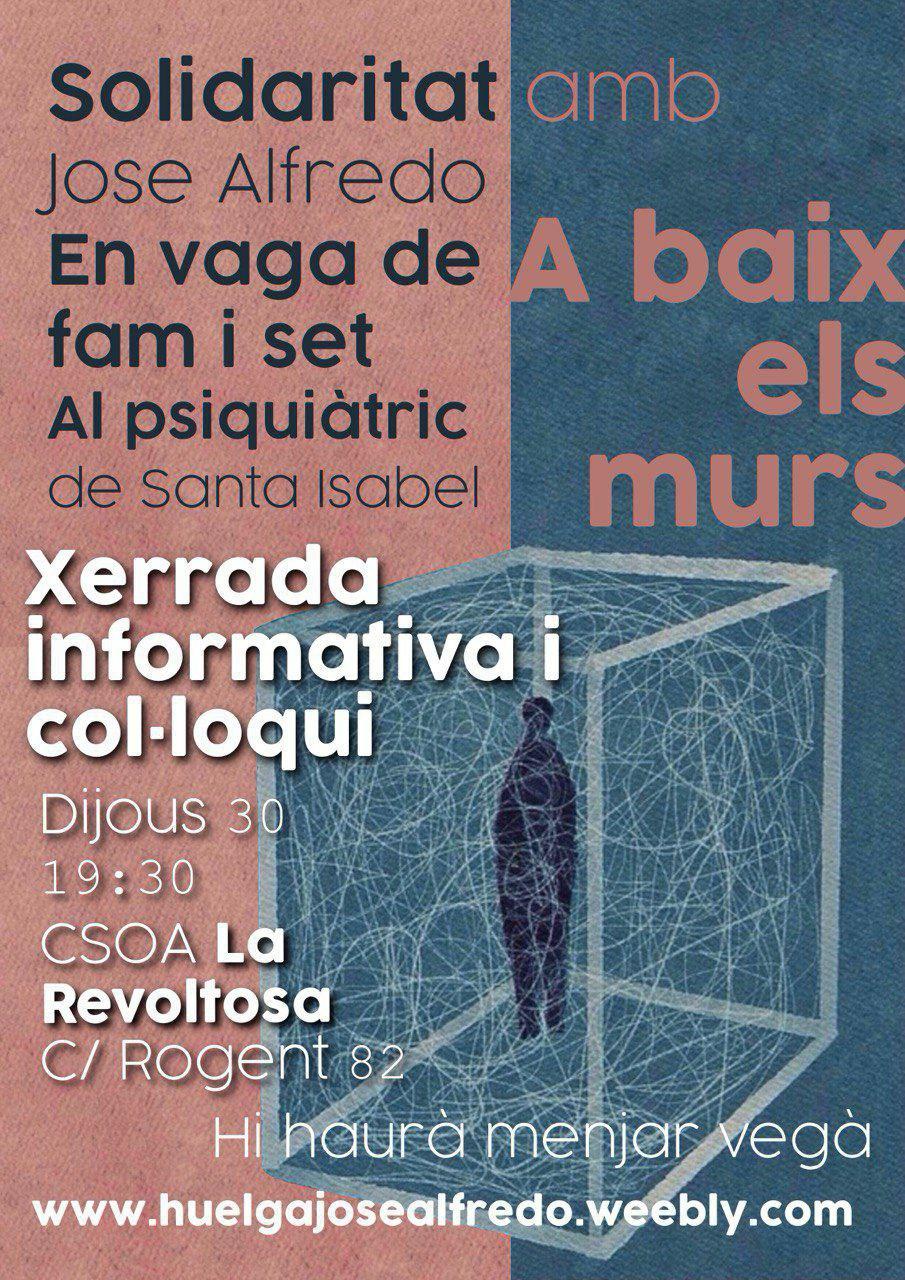 Aquest proper *dijous 30 de gener* ens trobem al *CSOA La Revoltosa a les 19:30* per parlar sobre la *vaga de fam i set de Jose Alfredo*, tancat des de fa més de 5 anys al psiquiàtric de Santa Isabel de León